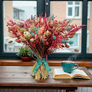 Le bouquet paradise est composé de fleurs séchées de couleurs vives ,fushia, bleu ciel, bordeaux, naturel.