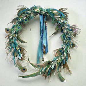 Cette jolie couronne murale est composée de fleurs séchées et de plumes de paon, c’est une création unique.