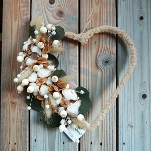 Le coeur Mélina est composé de fleurs séchées blanches et vertes, il mesure environ 23cm par 20cm.