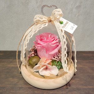 La rose éternelle rose est une rose rose pâle stabilisée présentée sous une cloche en verre et accompagnée de fleurs séchées.