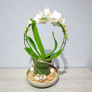 Phalenopsis blanc monté sur arceau et présenté sur une assiette en céramique brune.