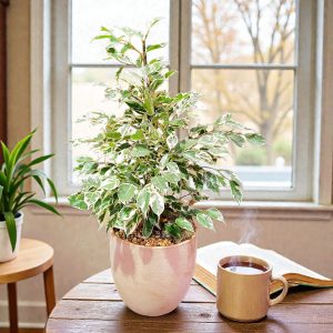 Le ficus benjamina est ici panaché blanc et vert, il est présenté dans un pot en céramique beige cuivré.