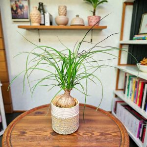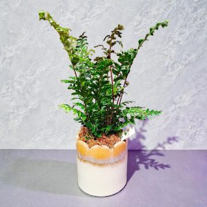 Il est présenté dans un joli cache pot style coquille d’oeuf très tendance.