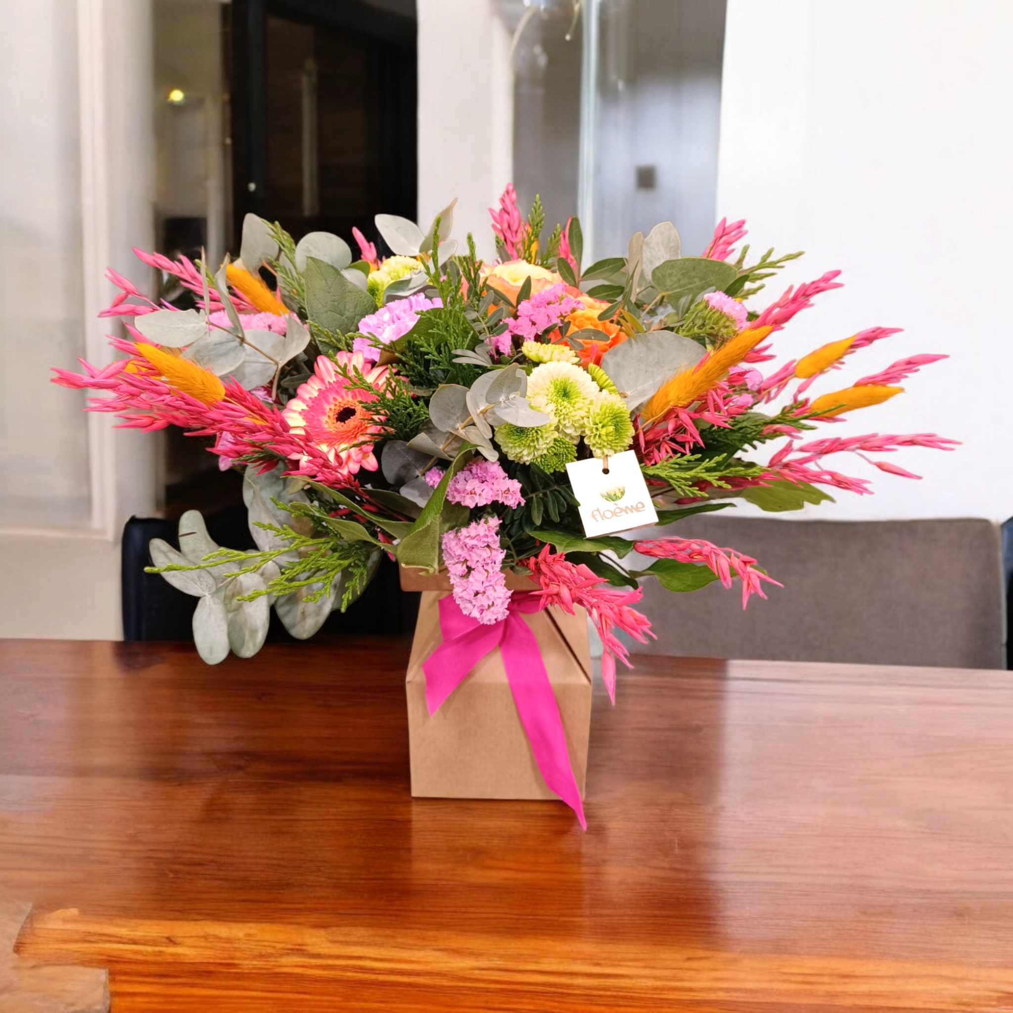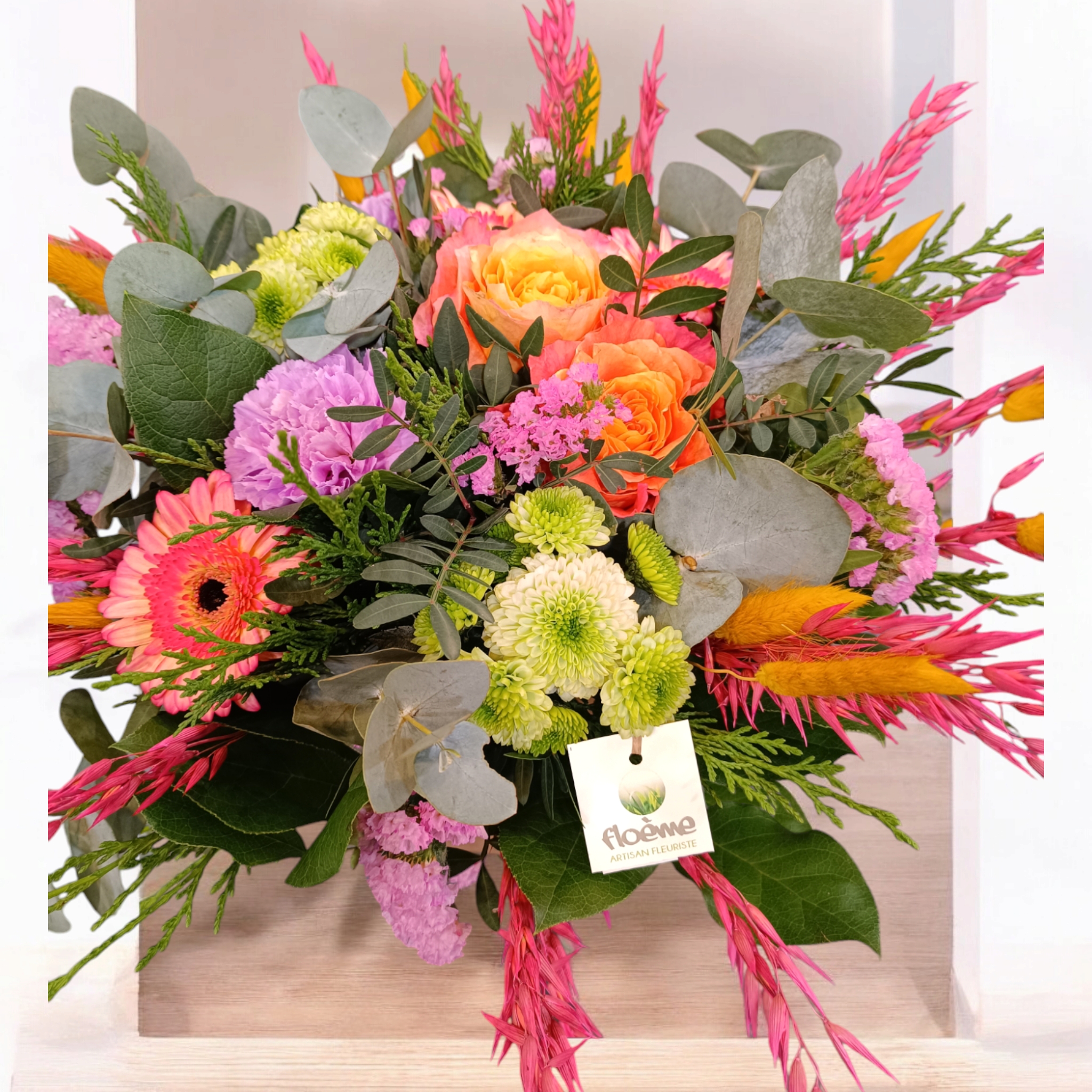 Le bouquet Mathilda est un bouquet rond de couleurs orange, rose soutenu, jaune, saumon… très pepsi , une touche de bonne humeur dans la maison !