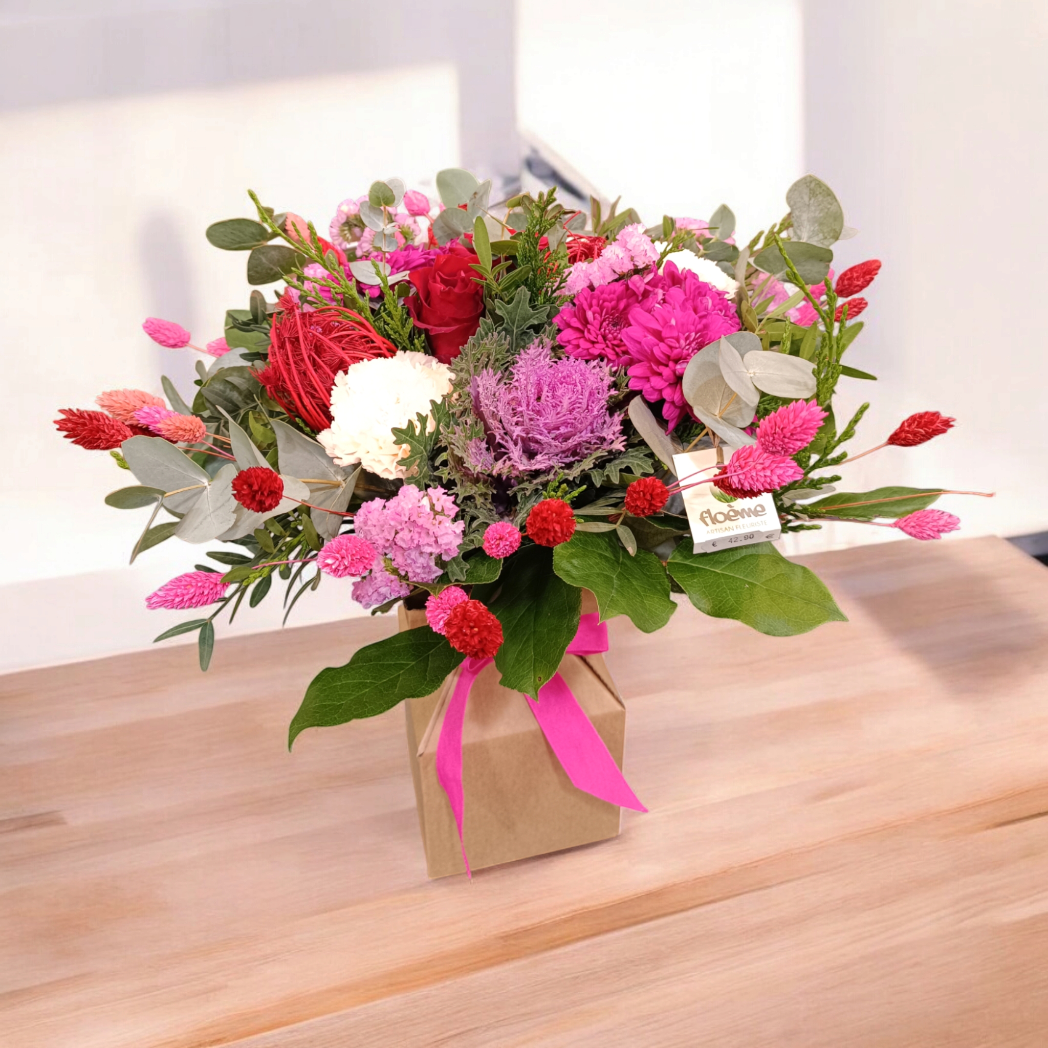 ce bouquet est présenté dans son vase en carton couleur Craft.
