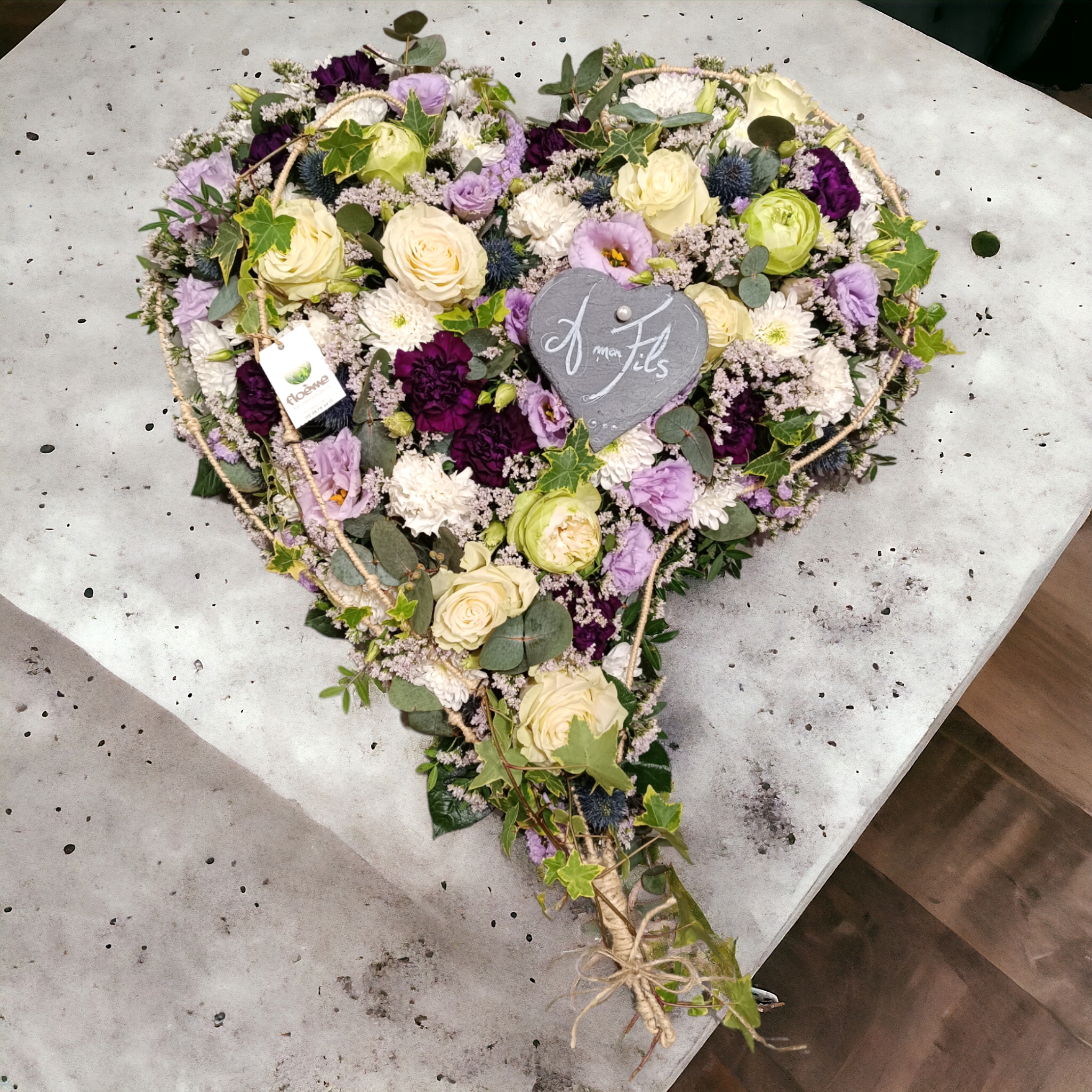 Le cœur est une pièce symbolique composée de fleurs variées, ici dans un dégradé de bleu, Parme , blanc et vert.